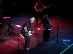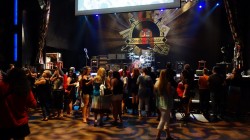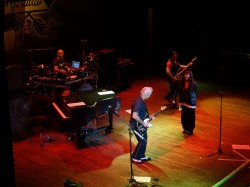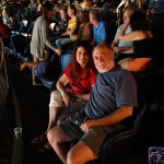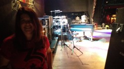So we lounge around, Joe decides to buy a “35th+ Anniversary” shirt at the venue so keeps on his swanky t-shirt. I wash my stinky sandal feet, change my shirt, and off to the venue we go. We walk – it’s close – 2 blocks. We sweat like demons outside the venue to get tix and passes. The Will-Call window seemed to be at the focus of all the rays of the sun. Jimmy set us up well. Box seats…front row!!! No GA, thank goodness. The sardine days are over for us. We go in and have to walk thru the restaurant to the ‘venue’. Joe asks an employee – who looks like she’ll kick your ass waaaaay over there if you say the wrong thing… ‘where and when do we go for the MnG (there were no instructions from Jimmy)?’ She checks and points to the VIP line – wow, 8 of them tonight! But then realizes we are not VIP’s, just ‘sticker people’. That’s when Erin walks by, and Joe states “she knows us, she’s with the band…” And Erin says to the ass-kicker girl “I’ll take care of them.” The girl ‘gets it’ and listens. Erin calls Jimmy real quick, tells us to go have a drink at the bar and come to the sound board around 7:00. She says when you are in a ‘real city’ there are usually more VIP’s. The number is manageable, but she doesn’t like it to get to 10, as then it becomes too hard to juggle.