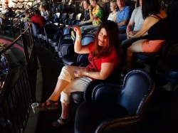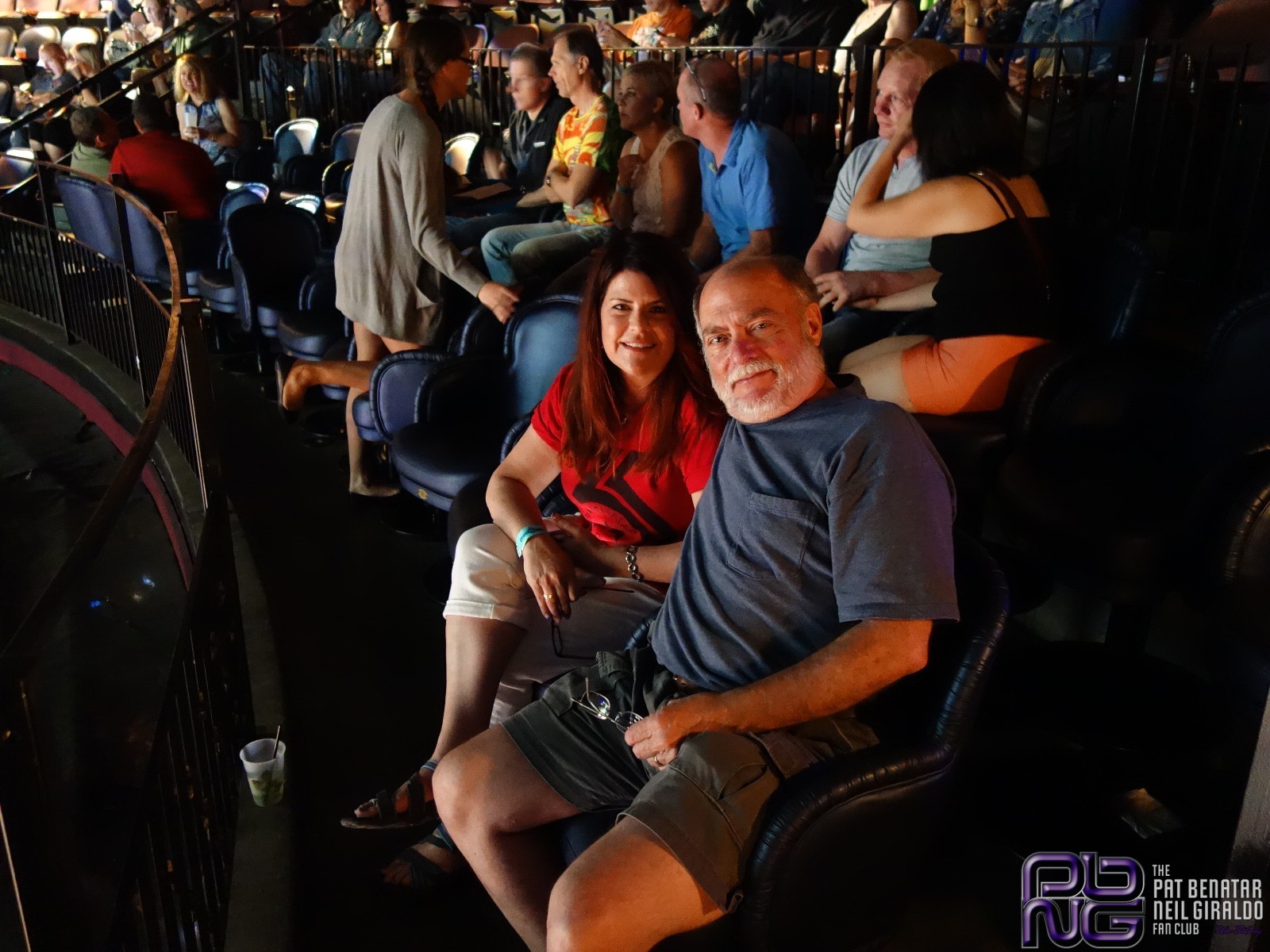 Seats – awesome! And comfortable! Swiveling chairs padded just the right amount and with lots of leg room. We ordered a couple of small plastic cups of wine 😉 The guy behind us ended up sitting next to me, as that seat was open. He’s a fan club member and saw Pat numerous times backstage when younger as he had some connections. I told him Joe and I were there from the fan club, and he said to me, “Okay, I thought you looked familiar.” Very nice guy. Curtis.