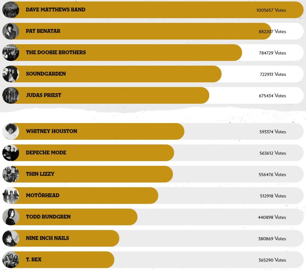 Voting for this year’s fan nominations for the Rock and Roll Hall of Fame ended on January 10, 2020.  This year’s inductees will be announced at 8:00am EST on January 15 on SiriusXM Channel 106 – and probably a lot of other places shortly thereafter.  Results of the voting are captured below.